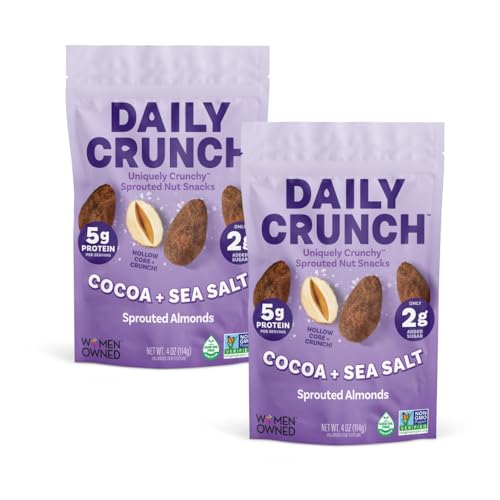 Daily Crunch Sprouted Almonds and Dehydrated nuts for a Unique Crunch, Keto Friendly, Non-GMO Zero Seed Oils, Gluten Free 4oz (2 Pack, Cocoa & Sea Salt)