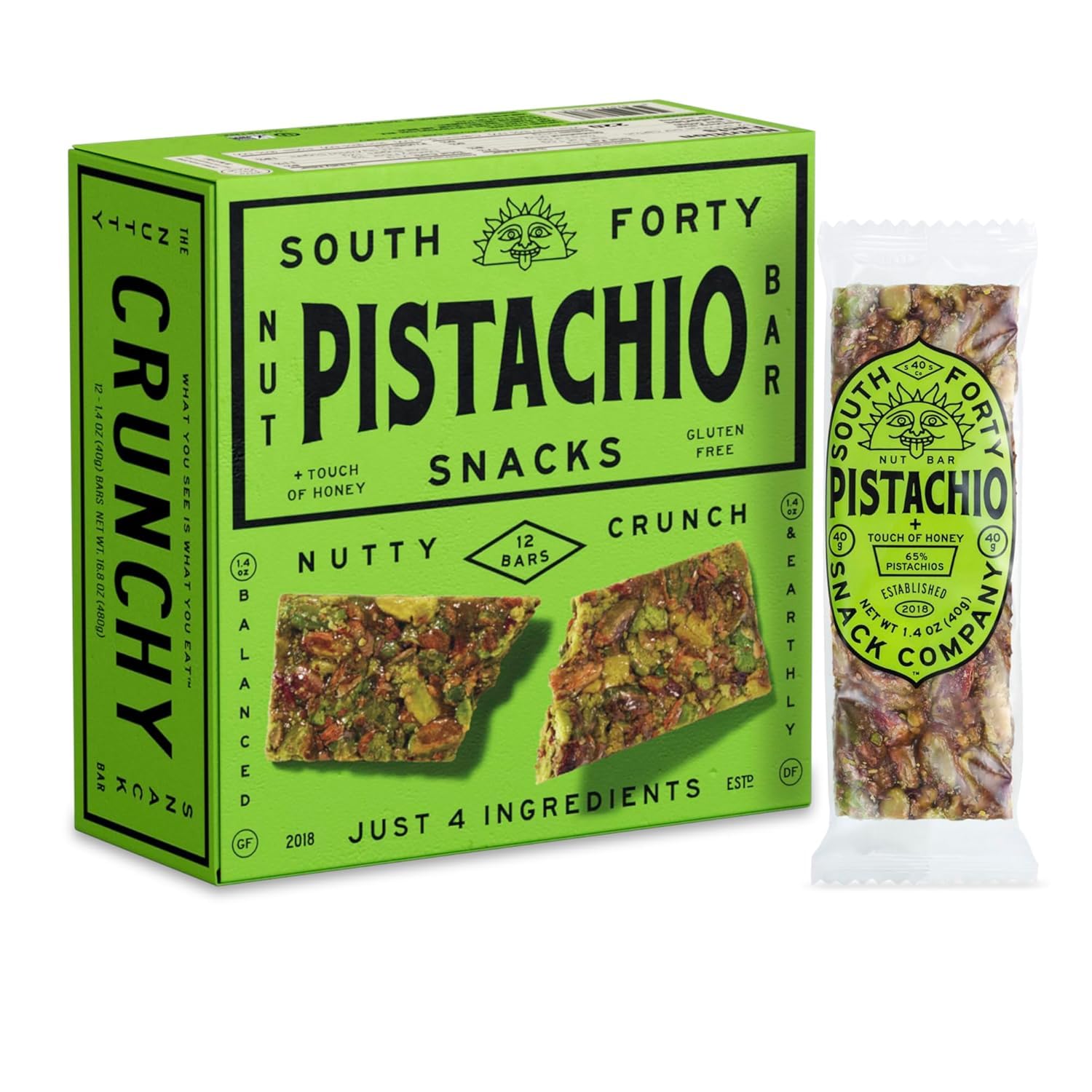 South 40 Snacks Crunchy Pistachio Bars with Honey, 4 Simple Ingredients, Gluten Free Nut Bars, Plant Based Protein Snack, 40g Bars, 1.4oz